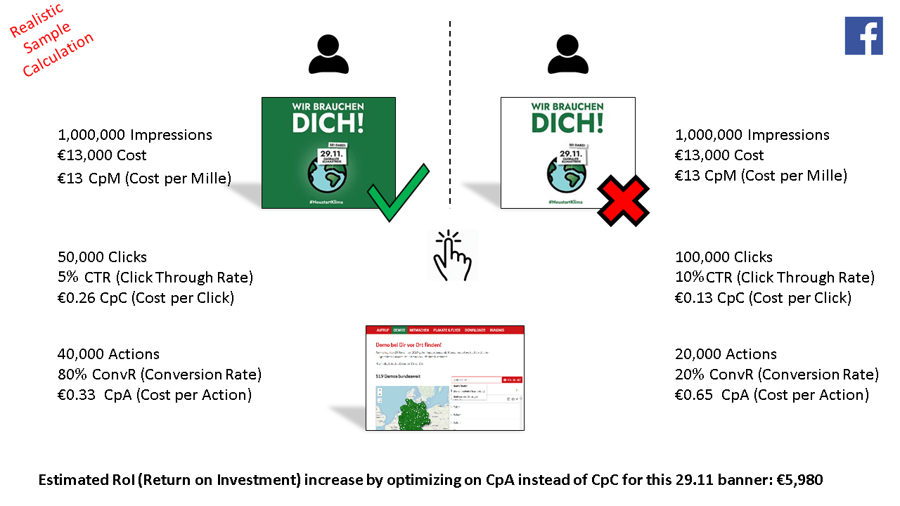 Try to always optimized against CpA (Cost per Action), so you don’t fall into the CpC (Cost per Click) Trap: even though the white banner has a better CpC, the green one has a better CpA.